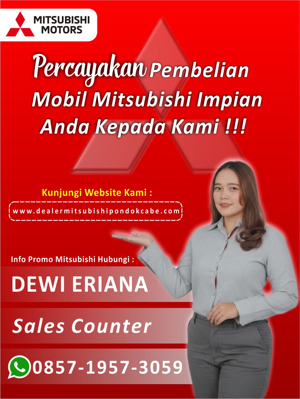 Mitsubishi Pondok Cabe - Melayani penjualan mobil secara Cash dan Credit untuk All-Type Mobil Mitsubishi. Pengajuan secara kredit dapat melalui Mitra Finance kami tentunya dengan Down Payment Rendah dan Angsuran Terjangkau. Harga yang tertera belum masuk promo diskon atau cashback yang tersedia, dan harga tersebut dapat berubah kapan saja.